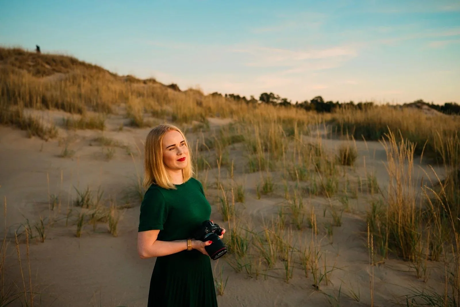 Tamperelainen valokuvaaja hiekkarannalla vihreässä mekossa.